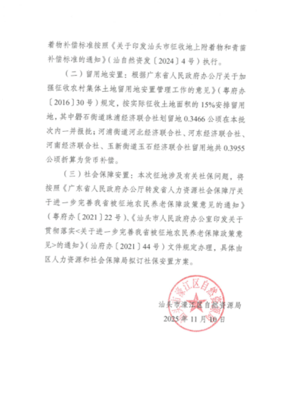 (二)留用地安置。根據《廣東省人民政府辦公廳關于加強征收農村集體土地留用地安置管理工作的意見》(粵府辦〔2016〕30號)的規定,按實際征收土地面積的15%安排留用地,其中礐石街道珠浦經濟聯合社劃留地0.3466公頃在本批次內一并報批;河浦街道河北經濟聯合社、河東經濟聯合社、河南經濟聯合社、玉新街道玉石經濟聯合社留用地共0.3955公頃折算為貨幣補償。