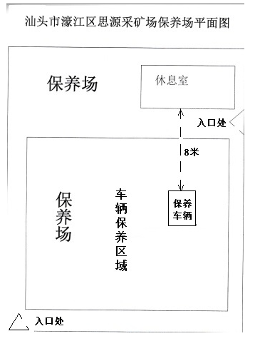 思源礦場在東南側(cè)方向配套設置車輛保養(yǎng)場,占地面積約200平方米,保養(yǎng)場共有3名員工,陳進雄為負責人,員工為李橋友、馬啟軍,保養(yǎng)場按要求設置管理制度、操作規(guī)程,場內(nèi)懸掛安全生產(chǎn)警示標志。保養(yǎng)場內(nèi)配置一批保養(yǎng)工具,其中油壓千斤頂4臺(包括千斤頂壓限鈕桿等工具),32T和20T油壓千斤頂荷載量各為2臺,均為山東阜陽工具有限公司制造,獲ISO9001質(zhì)量體系認證,生產(chǎn)許可證號:XK06-005-00085;32T油壓千斤頂屬調(diào)整型,最低高度230㎜,起升高度140㎜,調(diào)整高度60㎜,20T油壓千斤頂屬F型,最低高度190㎜,起升高度100㎜,調(diào)整高度60㎜。現(xiàn)場保養(yǎng)的車輛為一輛粵D12059牌照的自卸車,重量為12.49T,自卸車只用于礦場運載沙石任務。事發(fā)前,李橋友、馬啟軍正在對粵D12059自卸車進行保養(yǎng),千斤頂使用時處于正常狀況,千斤頂所頂?shù)能囕v位置符合保養(yǎng)要求,千斤頂承載車輛重量處于承載范圍內(nèi)。根據(jù)礦場平面圖顯示,保養(yǎng)場在礦場開采作業(yè)范圍之外(見附圖1—2)。
