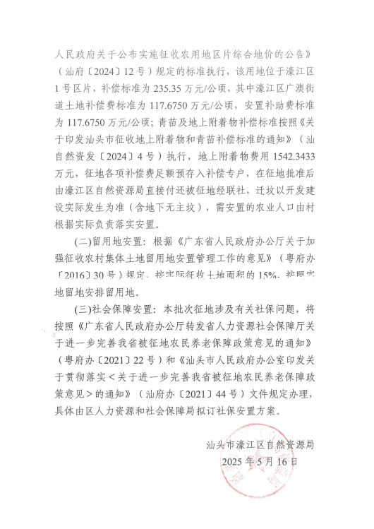 對本征地補(bǔ)償安置方案有異議的,請于2025年5月22日2025年6月20日內(nèi)持土地權(quán)屬證明材料等向汕頭市濠江區(qū)自然資源局提交書面意見。異議提交地址為:汕頭市濠江區(qū)自然資源局(聯(lián)系人:周基榮;電話:0754—87874502)。在規(guī)定時間內(nèi)未提交書面意見的,視為無異議。我區(qū)將在收取意見后,對符合《中華人民共和國土地管理法》《中華人民共和國土地管理法實(shí)施條例》《廣東省土地管理?xiàng)l例》規(guī)定條件的,依法依規(guī)組織聽證。