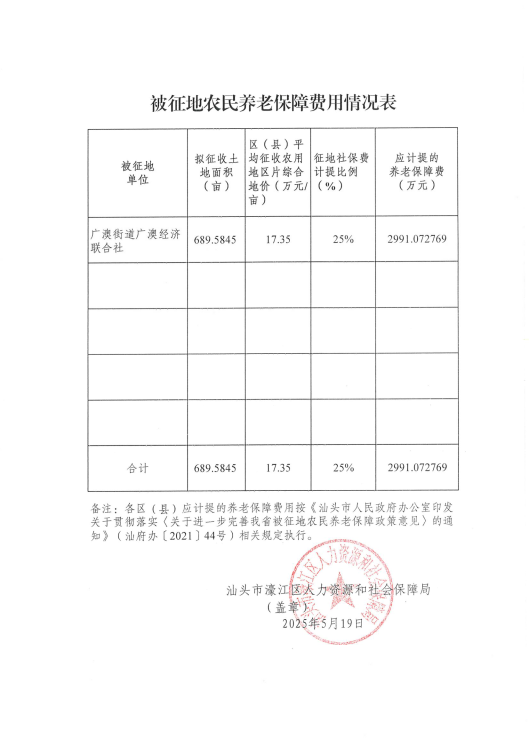 根據(jù)《廣東省人民政府辦公廳轉(zhuǎn)發(fā)省人力資源社會保障廳關(guān)于進(jìn)一步完善我省被征地農(nóng)民養(yǎng)老保障政策意見的通知》(粵府辦〔2021〕22號)規(guī)定,核定該批次按我區(qū)17.35萬元/畝中心城區(qū)平均征收農(nóng)用地區(qū)片綜合地價25%的標(biāo)準(zhǔn)一次性計提征地社保費(fèi)預(yù)存入“收繳被征地農(nóng)民養(yǎng)老保障資金過渡戶”,費(fèi)用合計2991.072769萬元,專款用于被征地農(nóng)民的基本養(yǎng)老保險補(bǔ)貼。分配方式為平均分配。