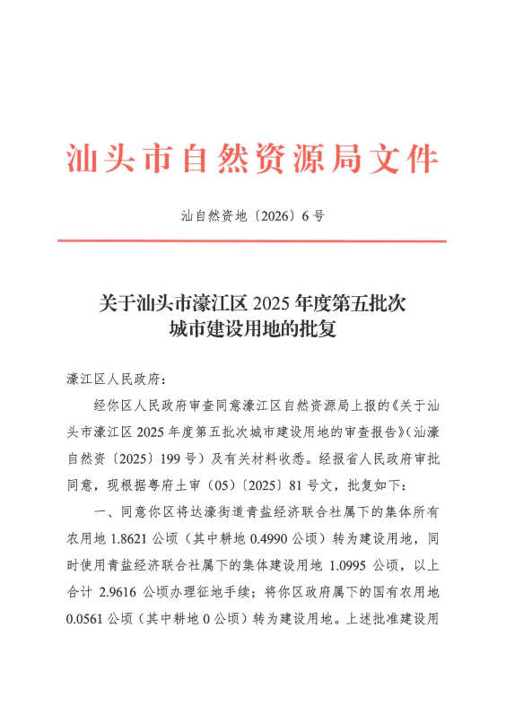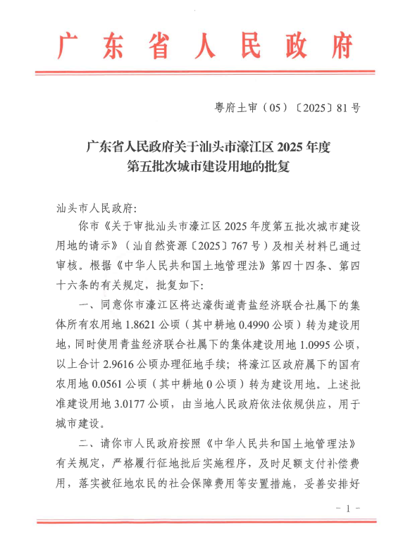 《廣東省人民政府關于汕頭市濠江區(qū)2025年度第五批次城市建設用地的批復》(粵府土審(05)〔2025〕81號)已經(jīng)廣東省人民政府批準。現(xiàn)將有關事項公告如下: