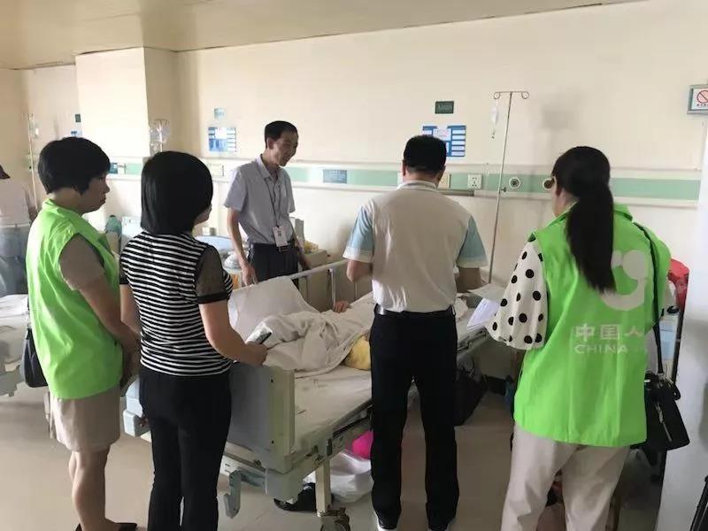 △市衛生健康局相關工作人員、保險公司工作人員向發生意外傷害住院老人講解“銀齡安康行動”保障內容