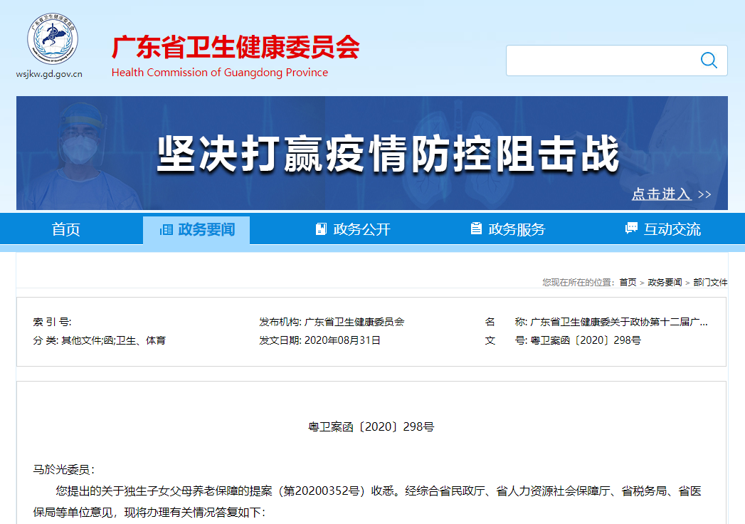 近日,廣東省衛生健康委發布《關于政協第十二屆廣東省委員會第三次會議第20200352號提案答復的函》(點擊查閱答復全文),對政協委員提出的“關于獨生子女父母養老保障的提案”,綜合省民政廳、省人力資源社會保障廳、省稅務局、省醫保局等單位意見,進行回應。