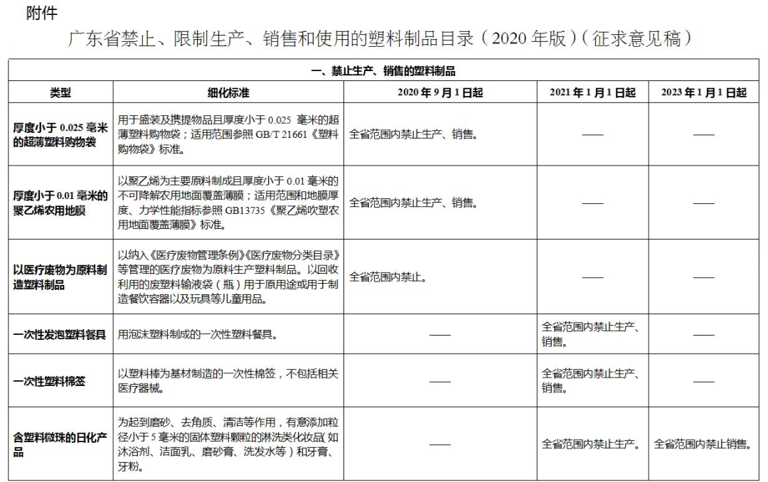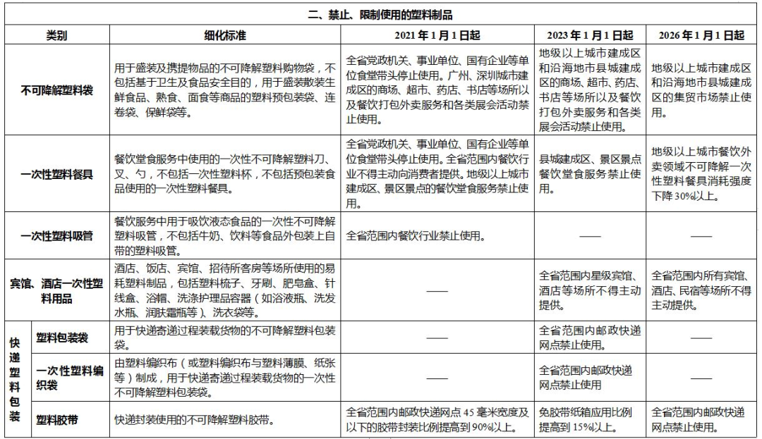 為便于各地執(zhí)行《省實施意見》,省發(fā)展改革委、省生態(tài)環(huán)境廳制定了《廣東省禁止、限制生產(chǎn)、銷售和使用的塑料制品目錄(2020年版)》,明確了相關禁限細化標準、區(qū)域范圍和時間節(jié)點。