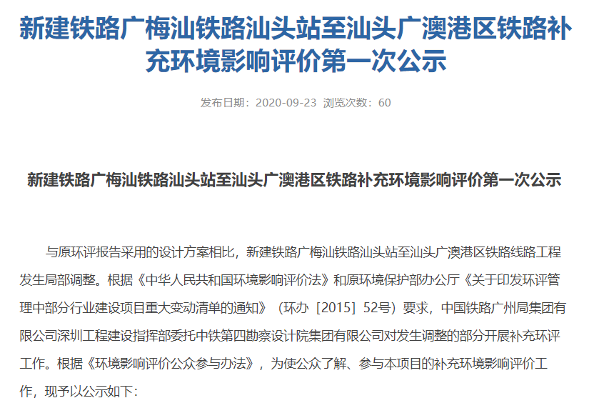 記者了解到,與原環(huán)評報告采用的設(shè)計方案相比,新建鐵路廣梅汕鐵路汕頭站至汕頭廣澳港區(qū)鐵路線路工程發(fā)生局部調(diào)整。根據(jù)《中華人民共和國環(huán)境影響評價法》和原環(huán)境保護部辦公廳《關(guān)于印發(fā)環(huán)評管理中部分行業(yè)建設(shè)項目重大變動清單的通知》(環(huán)辦〔2015〕52號)要求,中國鐵路廣州局集團有限公司深圳工程建設(shè)指揮部委托中鐵第四勘察設(shè)計院集團有限公司對發(fā)生調(diào)整的部分開展補充環(huán)評工作。根據(jù)《環(huán)境影響評價公眾參與辦法》,為使公眾了解、參與本項目的補充環(huán)境影響評價工作,目前正在進行公示。