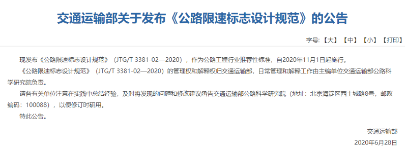 日前,交通運輸部發(fā)布了《公路限速標(biāo)志設(shè)計規(guī)范》,作為公路工程行業(yè)推薦性標(biāo)準(zhǔn),自2020年11月1日起施行。 在2020年11月1日實行后,全國將統(tǒng)一、規(guī)范限速標(biāo)志,屆時大量不合理的限速標(biāo)志將面臨拆除。 今后,限速標(biāo)志將會切合實際交通狀況、沿線設(shè)施等情況做到科學(xué)設(shè)置,向駕駛員提供正確、及時的信息,實現(xiàn)一目了然。