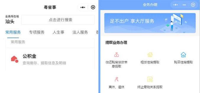 ▲“公積金業(yè)務(wù)在“粵省事”及“汕頭住房公積金“小程序上的展示頁面