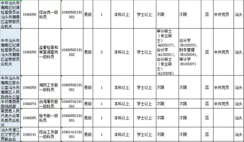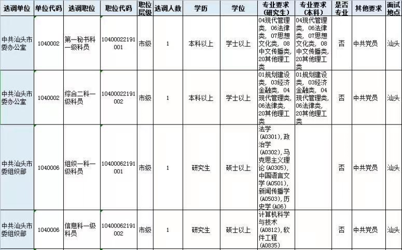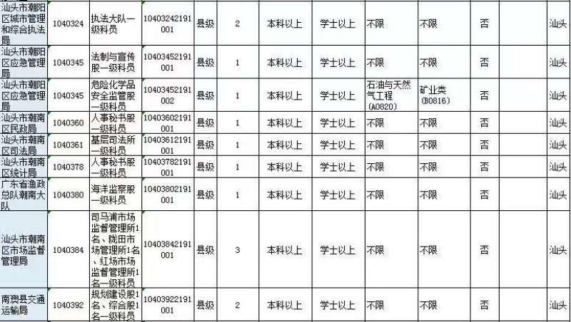 11月30日晚,廣東省委組織部、省人力資源和社會(huì)保障廳發(fā)布《廣東省2021年度選調(diào)優(yōu)秀大學(xué)畢業(yè)生公告》(下稱“公告”),全省共計(jì)劃選調(diào)應(yīng)屆優(yōu)秀大學(xué)畢業(yè)生1829名。南方+記者從公告中看到,汕頭市縣兩級(jí)共選調(diào)71人,涵蓋54個(gè)選調(diào)單位,大部分職位不限專業(yè)。