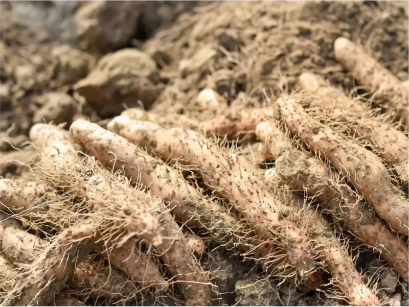 姜薯為纏繞藤本植物,葉為心形互生,取莖塊食用或藥用,莖塊一般長10到20厘米,粗5厘米左右,皮薄肉白,粉多且富含粘液,故有人稱姜薯為小淮山。其有溫肺、益乳、益肝、健脾、和胃、補腎、潤腸、養顏護膚、通血等藥用功效。姜薯適合于松軟肥沃、排灌方便、陽光充足的園地耕種,一般不宜連作,需水旱輪作,冬末春初為收獲季節。由于姜薯生長環境特殊,故產量稀少。因此,以姜薯入膳,在舊時可謂珍饈。
